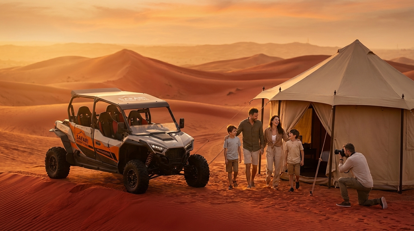 Safari Desert Dubai offers 24-hour booking, licensed guides, a modern maintained fleet and staged launch sites such as Al Marmoom and Lahbab Red Dunes. The company provides door-to-door pickup, transparent vouchers and day-of WhatsApp coordination to keep your family informed.